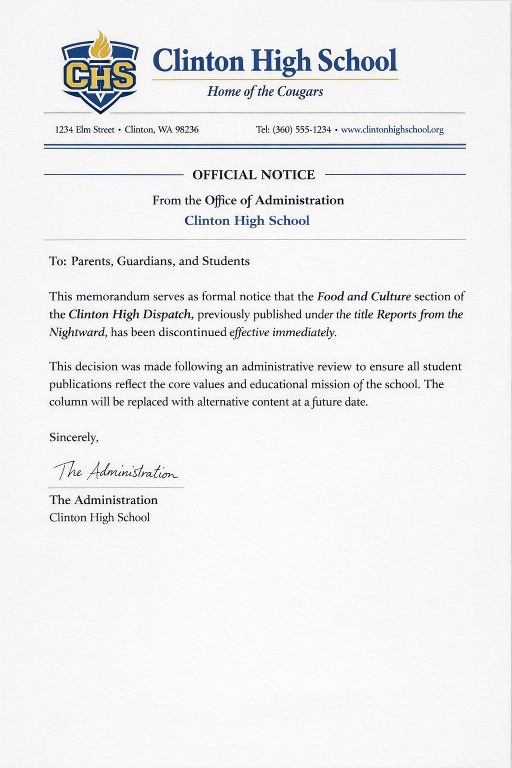 “Anna Okkes’ antics encourage unsafe behavior that, if emulated by others, would result in injury or the besmirching of the school’s sterling reputation.”